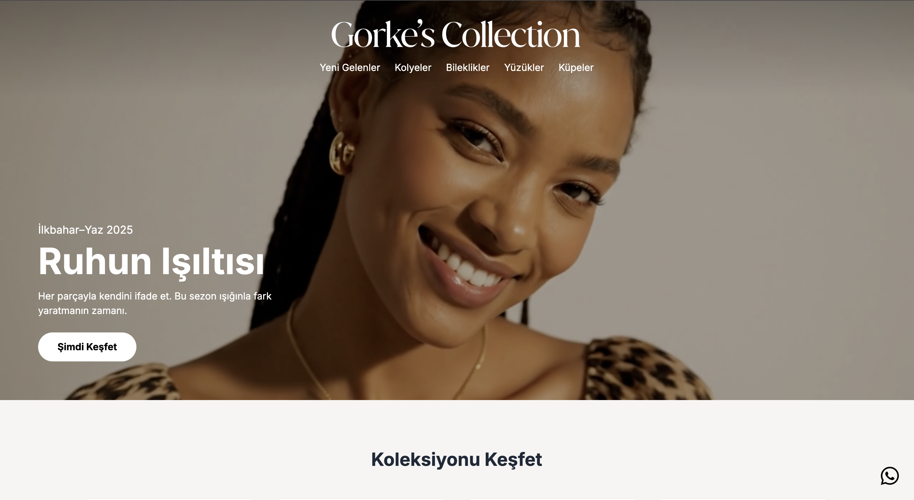 Gorke’s Collection, modern ve minimal kadın takılarını online olarak sunan, kullanıcı deneyimi ve dönüşüm odaklı tasarlanmış bir e-ticaret platformudur. Marka kimliği, performans ve satış süreçleri uçtan uca ele alınmıştır.